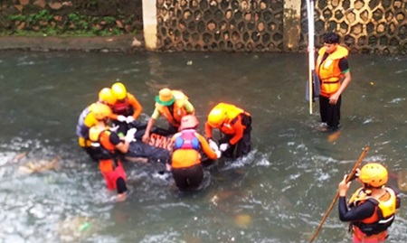 Tim gabungan terus melakukan pencarian menggunakan perahu karet untuk menelusuri Kali Mampang.